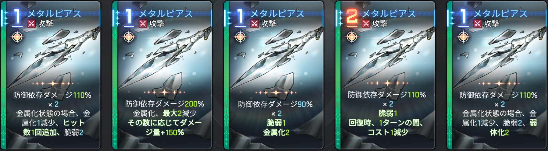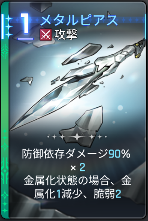 | 2 | 攻撃 | 敵全体に防御依存ダメージ100%×3。金属化、最大2減少、その数に応じてヒット数1回追加 |
