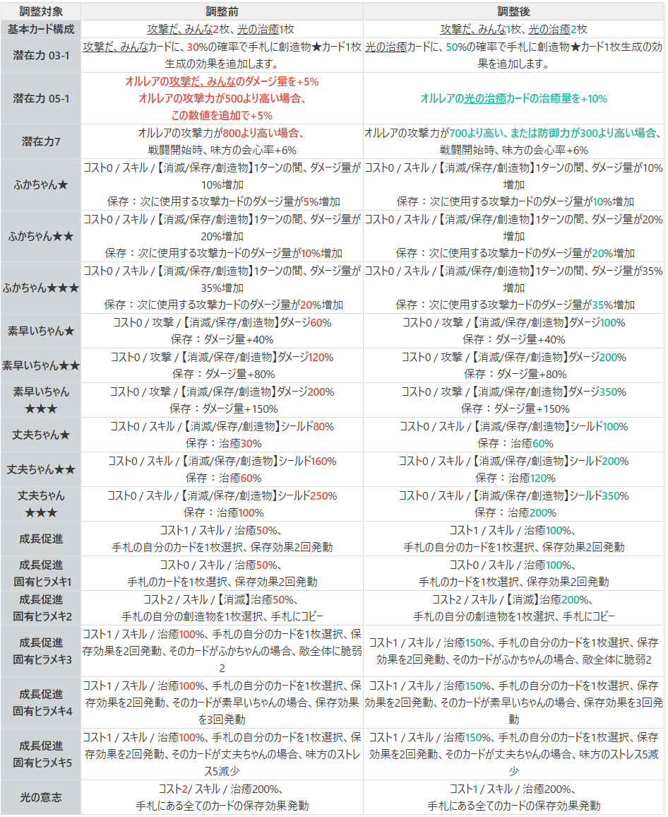| 1 | スキル | 治癒100% 手札の自分のカードを1枚選択、保存効果を2回発動 そのカードがふかちゃんの場合、敵全体に脆弱10)2 |
