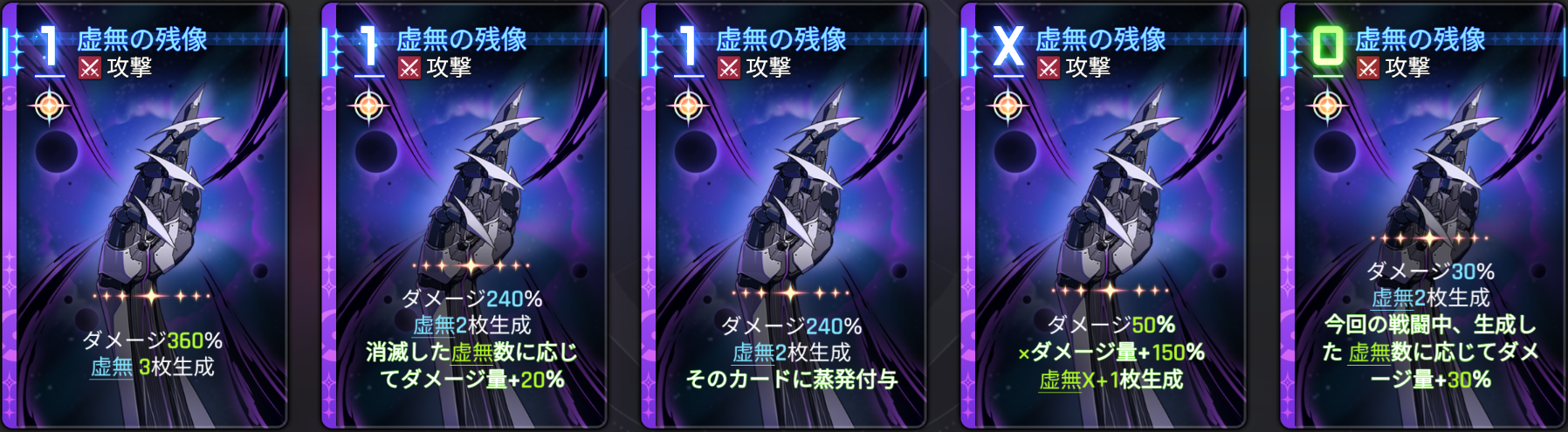 | 0 | 攻撃 | ダメージ30%。虚無2枚生成。今回の戦闘中、生成した虚無数に応じてダメージ量+30% |