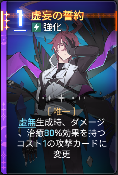| 1 | 強化 | [唯一]虚無生成時、ダメージ180%効果を持つコスト1の攻撃カードに変更 |