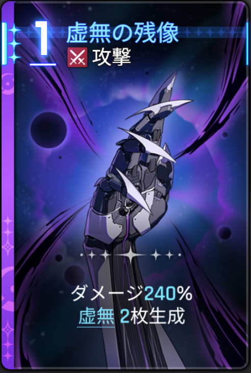 | 1 | 攻撃 | ダメージ240%。虚無 2枚生成 |