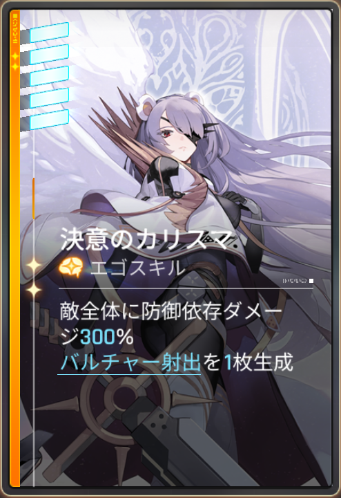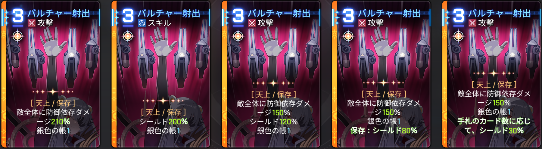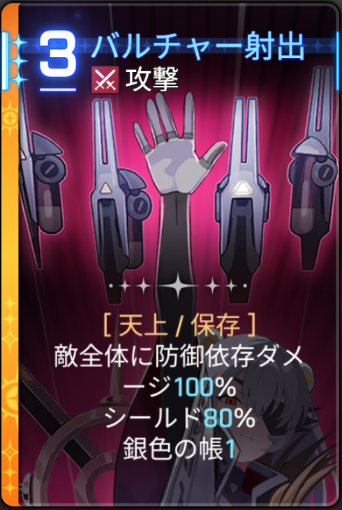 | 2 | 攻撃 | 敵全体に防御依存ダメージ220%。手札バルチャー射出がある場合、銀色の帳1 |