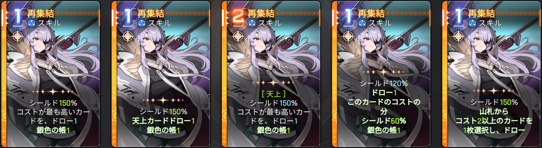 | 2 | スキル | [天上]。シールド150%。コストが最も高いカードを、ドロー1。銀色の帳1 |