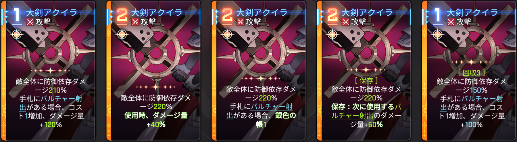 | 1 | 攻撃 | 敵全体に防御依存ダメージ150%。手札に手元バルチャー射出がある場合、コスト1増加、ダメージ量+100% |