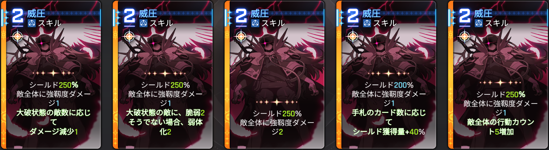 | 2 | スキル | シールド200%。敵全体に強靭度ダメージ1。手札のカード数に応じてシールド獲得量+40% |