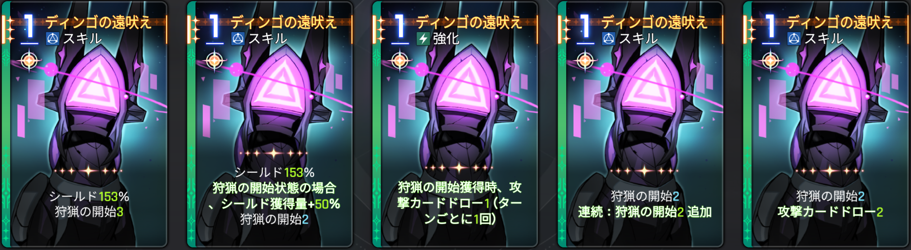 | 1 | 強化 | [開戦]他の戦闘員が強化またはスキルカード使用時、狩猟の開始1 ターン終了時、シールド20% |