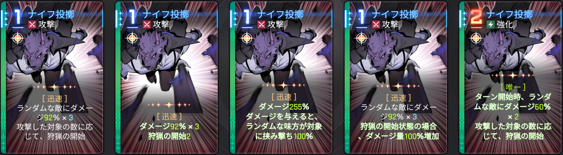 | 1 | 攻撃 | [迅速]ランダムな敵にダメージ60%×3。攻撃した対象の数に応じて、狩猟の開始 ドロー12)1 |