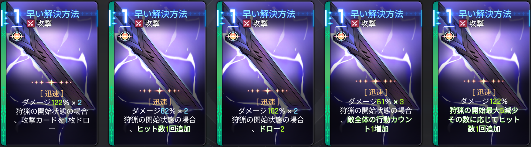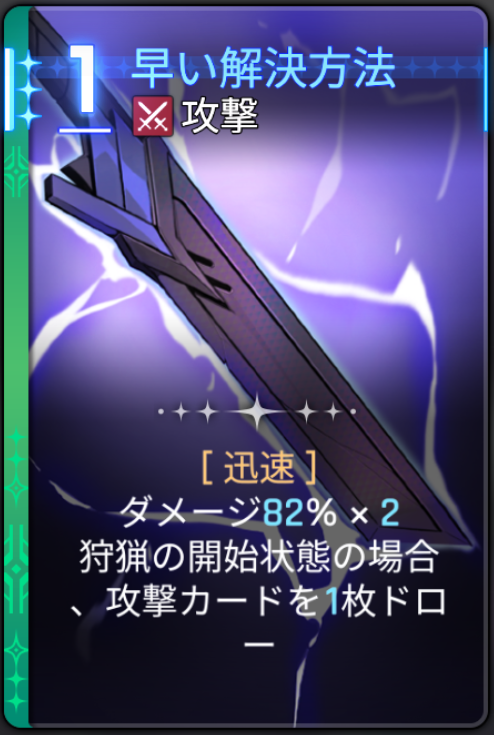 | 1 | 攻撃 | [迅速]ダメージ120%×2。狩猟の開始状態の場合、攻撃カードを1枚ドロー |