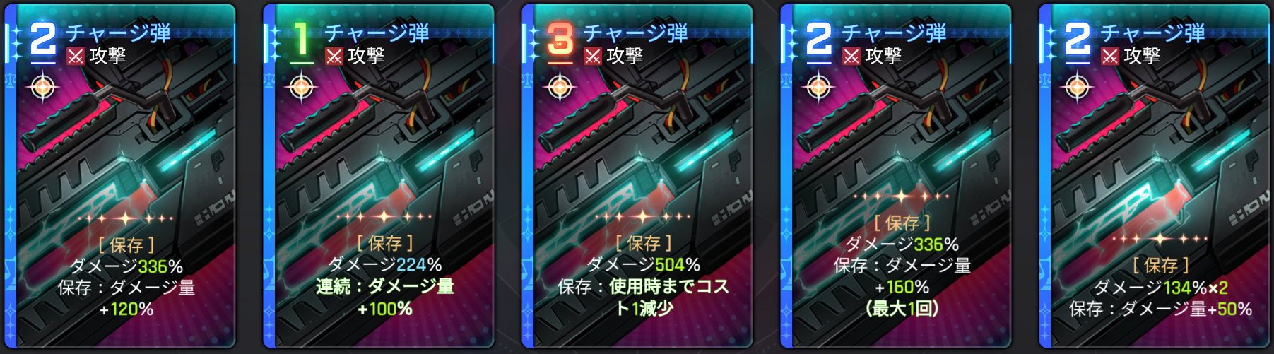 | 1 | 攻撃 | [保存]ダメージ200% 連続:ダメージ量+100% このカードのダメージ量30%増加 |