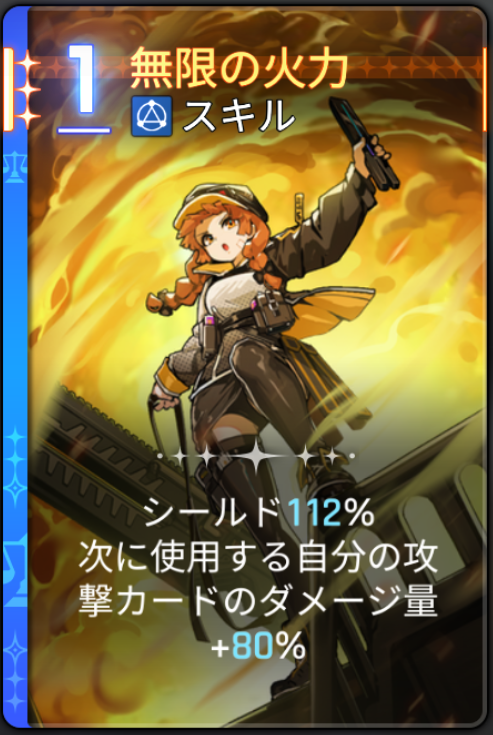 | 1 | スキル | シールド150% 次に使用する自分の攻撃カードのダメージ量+120% |