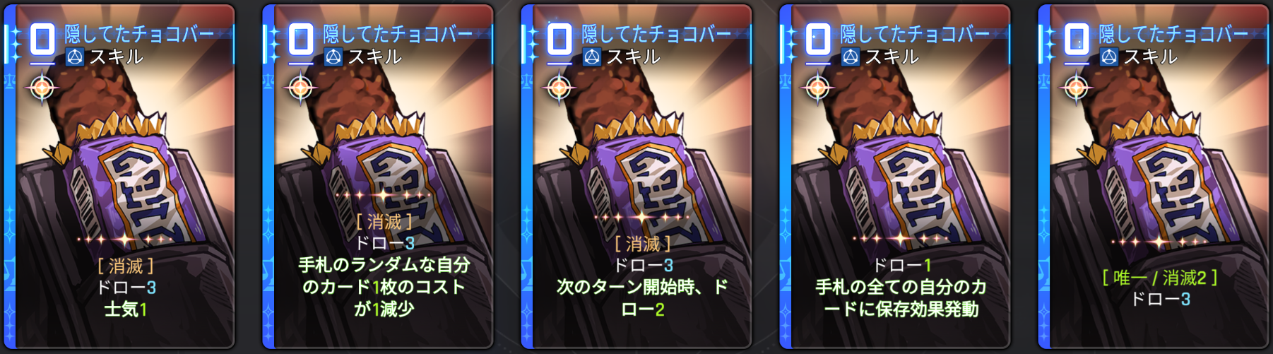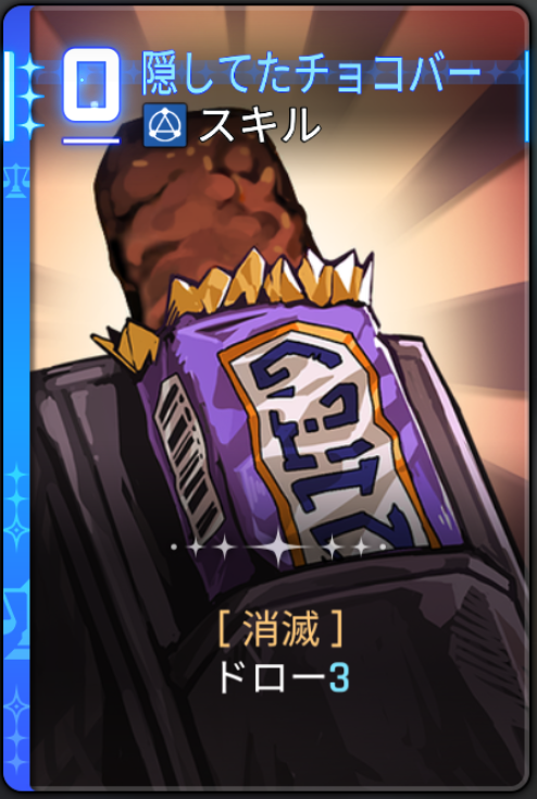 | 0 | スキル | [消滅]ドロー3 手札のランダムな自分のカード1枚のコストが1減少 |