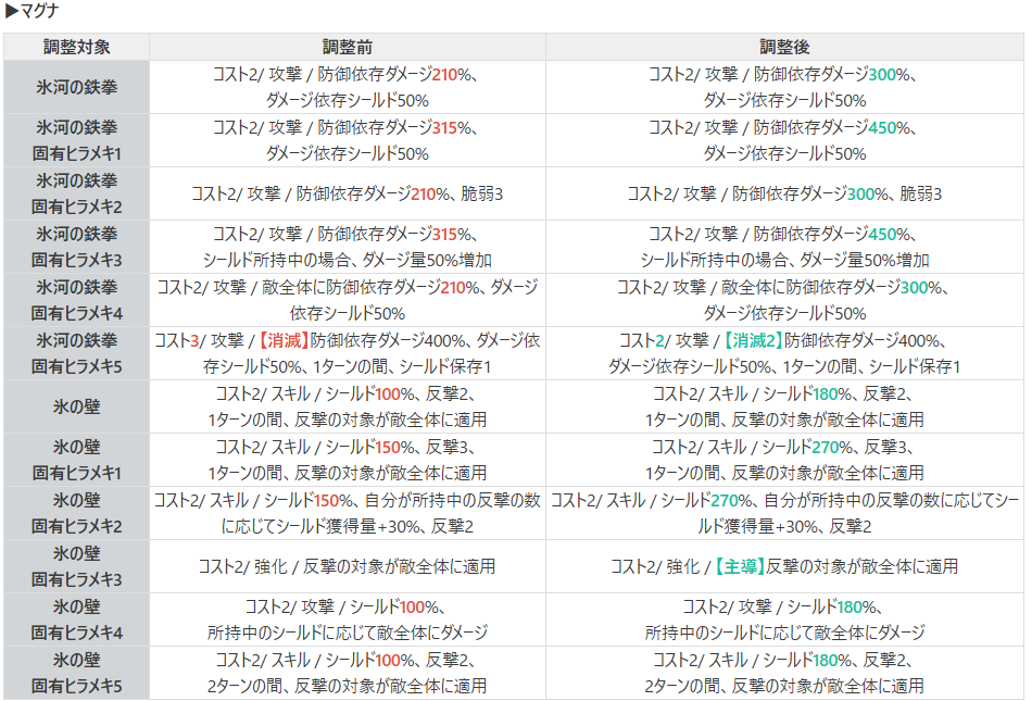 | 上部 | 基本カード熟練 | マグナの霜の盾シールド獲得量+5% マグナの防御力が250より高い場合、この数値を追加で5% |