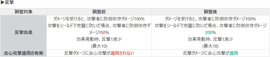 また、2月4日のアップデートにより防御依存ダメージ、シールド量などが軒並み上方修正される。反撃の仕様改修も合わせて、今まで以上に防御と反撃を成せるようになった。