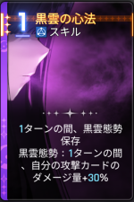 | 1 | スキル | 1ターンの間、黒雲態勢保存7) 黒雲態勢:1ターンの間、自分の攻撃カードのダメージ量+30% |