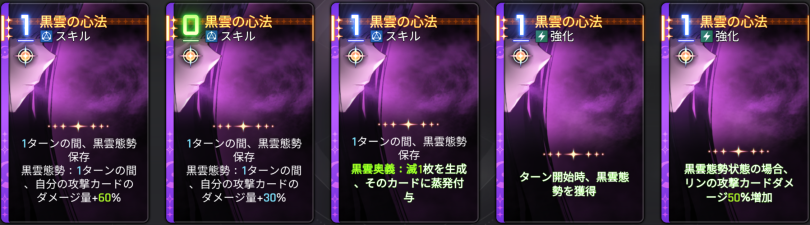 リンは、カード毎に効果が異なる「黒雲態勢」という独自のバフを持つ。