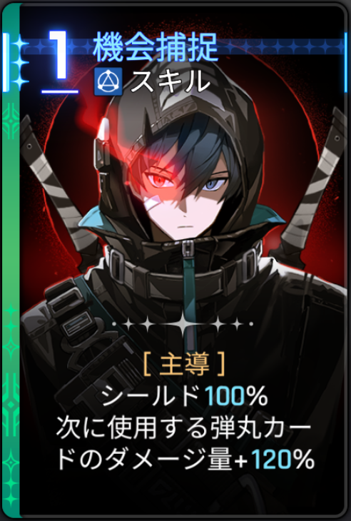 | 1 | スキル | [主導7)]。シールド100%。次に使用する弾丸カードのダメージ量+120% |
