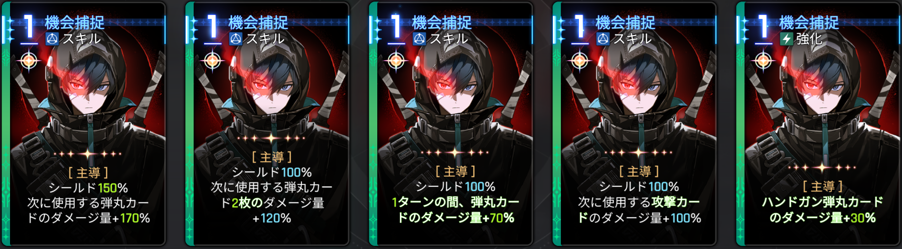 | 1 | スキル | ハンドガン弾丸2枚生成。そのカードの会心率+30% |
