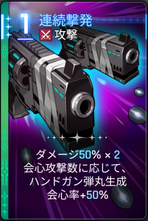 | 1 | 攻撃 | ダメージ50%。シールド50%。今回のターンで使用した弾丸カード数に応じて、ヒット数1回追加、シールド獲得量+50% |