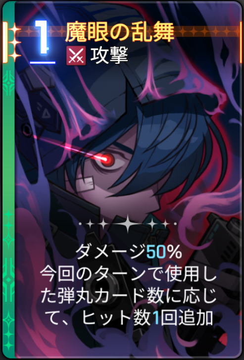 | 1 | 攻撃 | ダメージ50%。今回のターンで使用した弾丸カード数に応じて、ヒット数1回追加 |