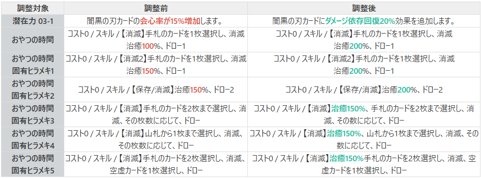 - レイの暗黒凝集のヒラメキ4番目のカードを使用する際、消滅済みカードにあるカードまで選択できてしまい、ダメージ強化効果を受けられなかった不具合が改善されます。