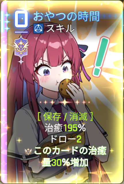 | キルケン | 0 | スキル | [保存/消滅]治癒195% ドロー2 このカードの治癒量30%増加 |
