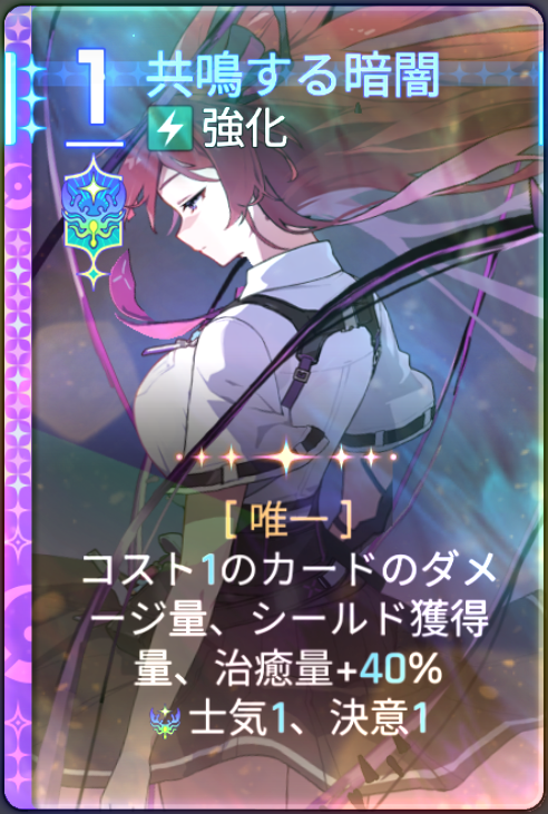 | 1 | 強化 | [唯一]コスト1のカードのダメージ量、シールド7)獲得量、治癒量+40% |
