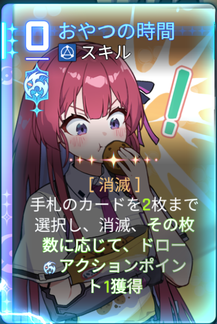 | 0 | スキル | [消滅]手札のカードを2枚まで選択し、消滅、その枚数に応じて、ドロー |