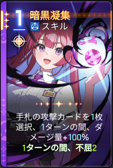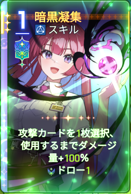 | 1 | スキル | 手札の攻撃カードを1枚選択、1ターンの間、ダメージ量+100% |