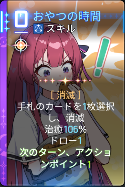 | 0 | スキル | [消滅]手札のカードを1枚選択し、消滅 治癒100% ドロー1 次のターン、アクションポイント1 |