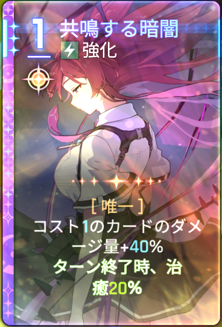 | 1 | 強化 | [唯一]コスト1のカードのダメージ量+40% ターン終了時、治癒20% |