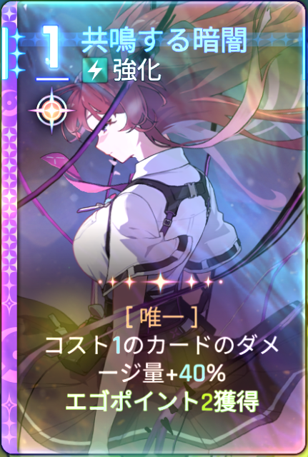 | 1 | 強化 | [唯一]コスト1のカードのダメージ量+40% エゴポイント2獲得 |