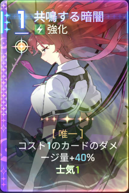 | 1 | 強化 | [唯一]コスト1のカードのダメージ量+40% |