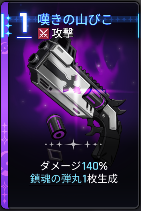 | 1 | 攻撃 | ダメージ140% 鎮魂の弾丸2枚生成 |