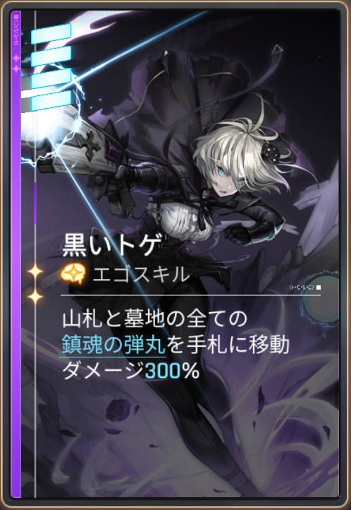 | 1 | 攻撃 | ダメージ50%×3 対象に手札の鎮魂の弾丸の数に応じて、標識10)1 |