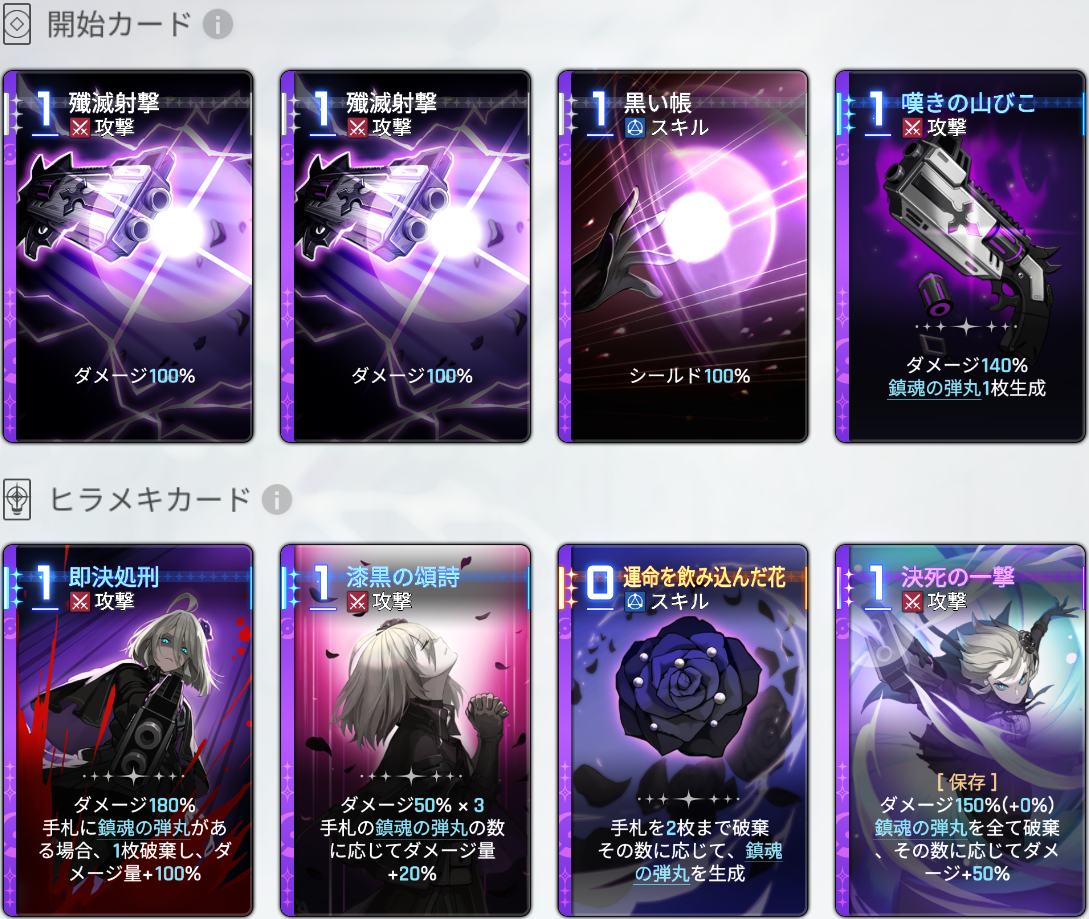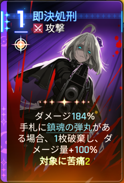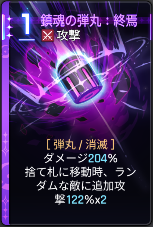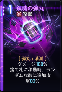 | 1 | 攻撃 | ダメージ180% 手札に鎮魂の弾丸がある場合、1枚破棄し、ダメージ量+100% |