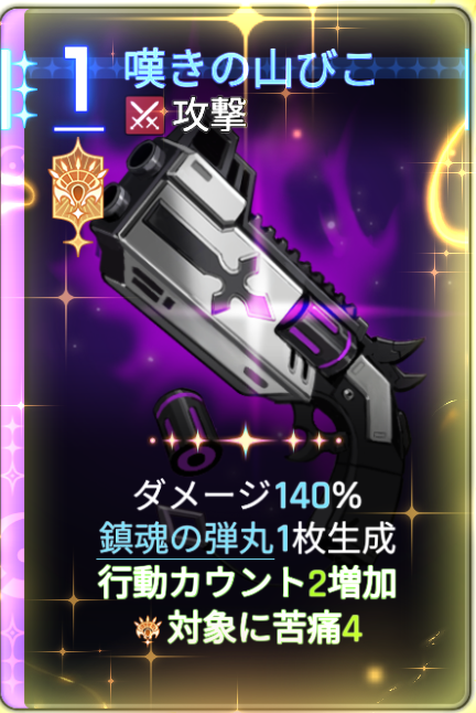 | 1 | 攻撃 | ダメージ140% 鎮魂の弾丸1枚生成、山札4)の鎮魂の弾丸2枚破棄5) |