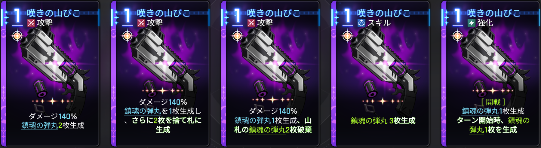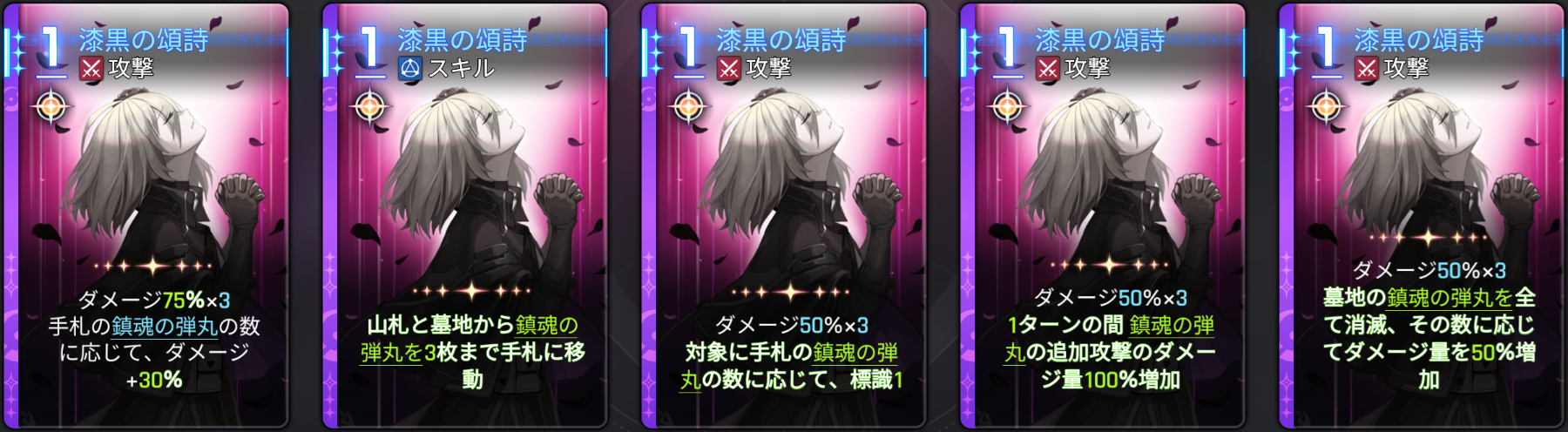 | 1 | 攻撃 | ダメージ140% 鎮魂の弾丸を1枚生成し、さらに2枚を捨て札3)に生成 |
