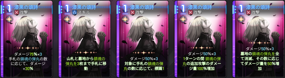 | 1 | 攻撃 | ダメージ75%×3 手札の鎮魂の弾丸の数に応じて、ダメージ+30% |