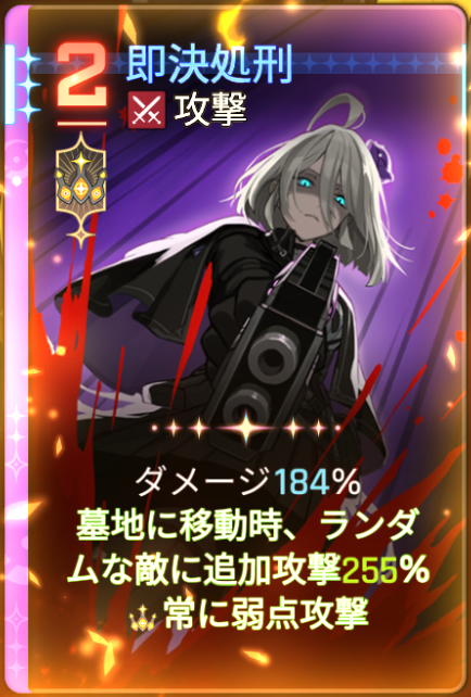 | 2 | 攻撃 | ダメージ180% 墓地に移動時、ランダムな敵に追加攻撃250% |