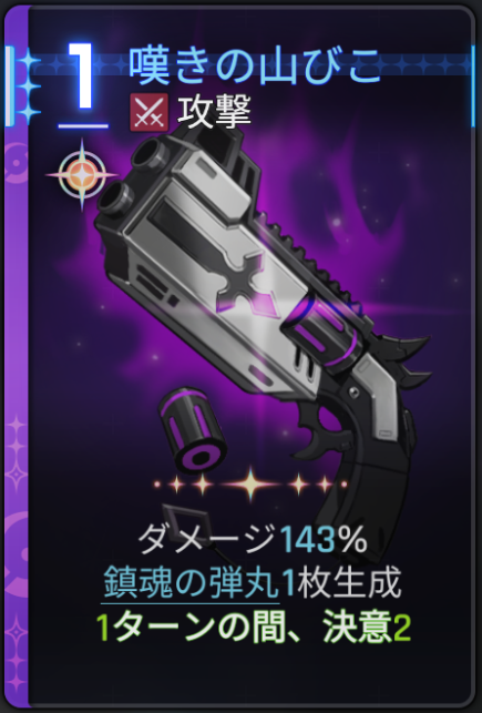 | 1 | 攻撃 | ダメージ140% 鎮魂の弾丸1枚生成 1ターンの間、決意2 |