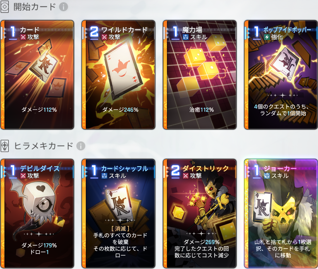 以上の流れだけなので、特に覚えることは無く、クエストに記載された条件に沿ってカードを切っていくだけで機能する。