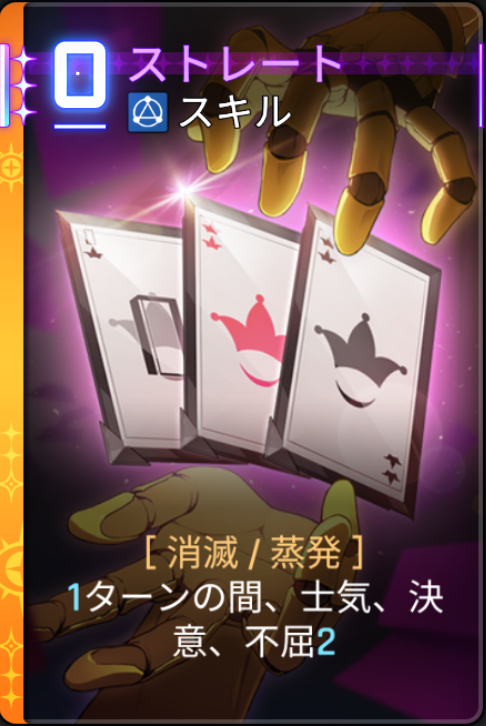 ストレート 0 スキル [消滅/蒸発]1ターンの間、士気、決意、不屈2