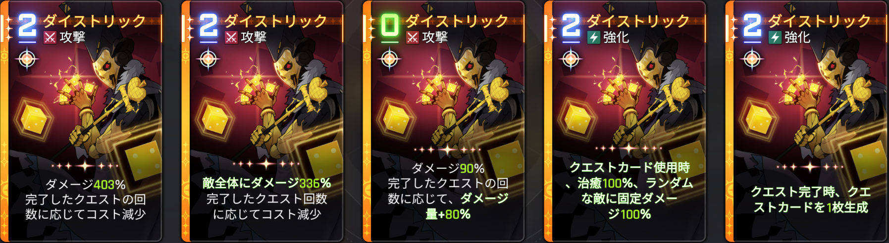 2 攻撃 ダメージ468%。完了したクエストの回数に応じてコスト減少 このカードのダメージ量30%増加
