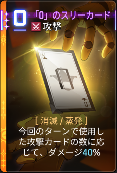 「0」のスリーカード 0 攻撃 [消滅/蒸発]今回のターンで使用した攻撃カードの数に応じてダメージ40%