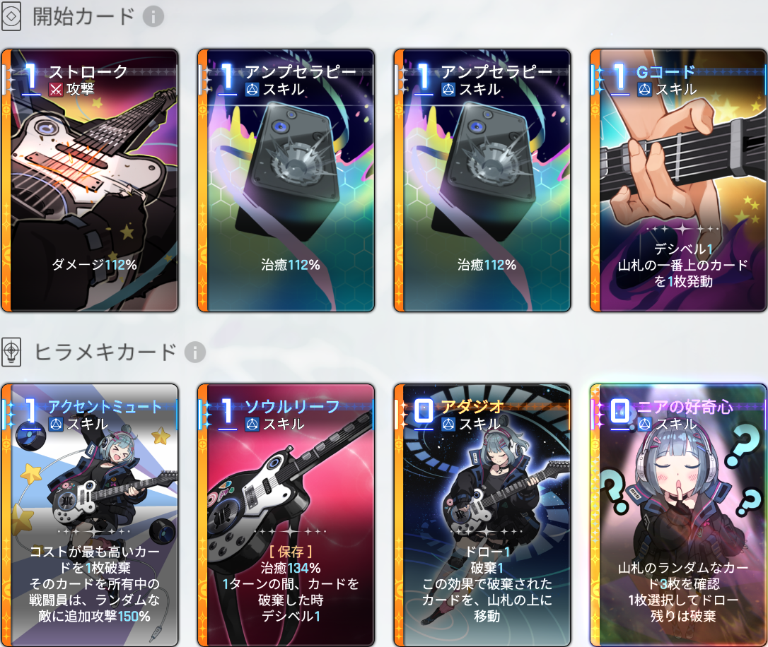 | 1 | スキル | [保存8)]治癒120%。1ターンの間カードを破棄したときデシベル1 |