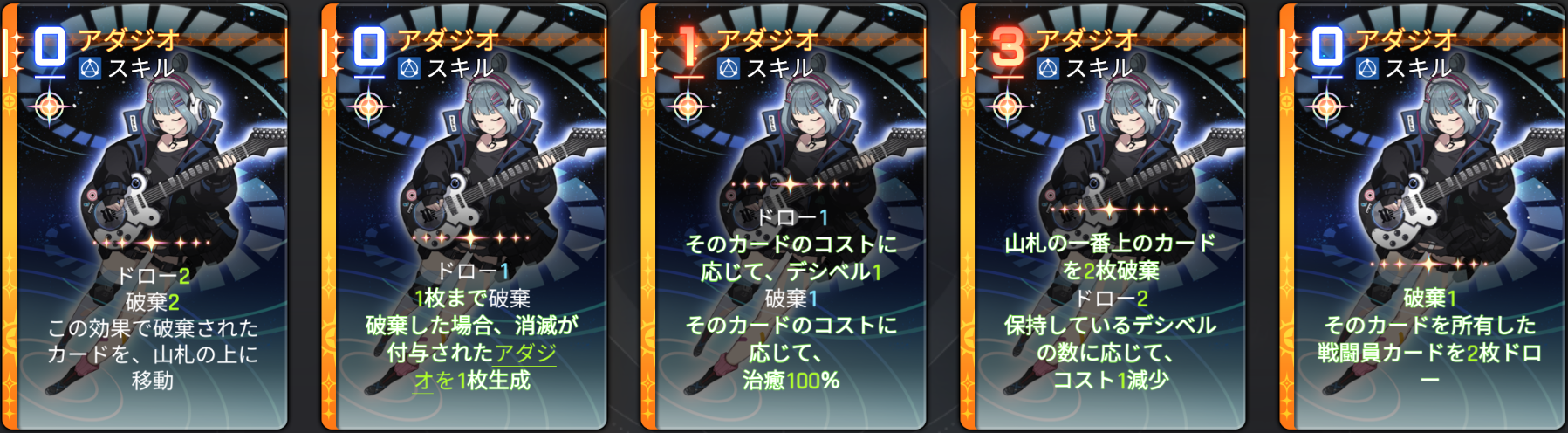 | 1 | スキル | ドロー1。そのカードのコストに応じて、デシベル1。破棄1。そのカードのコストに応じて、治癒100% |