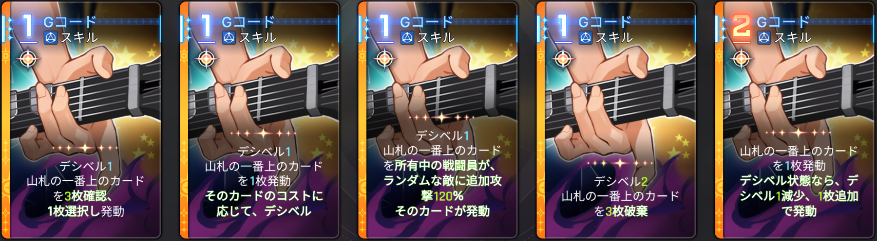 | 2 | スキル | 山札の一番上のカードを1枚発動。デシベル状態ならデシベル1減少、1枚追加で発動 |