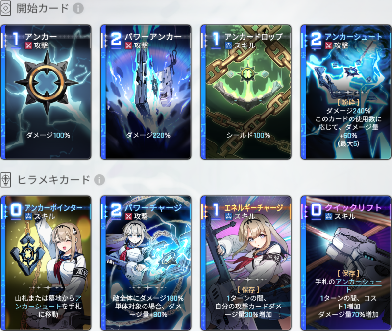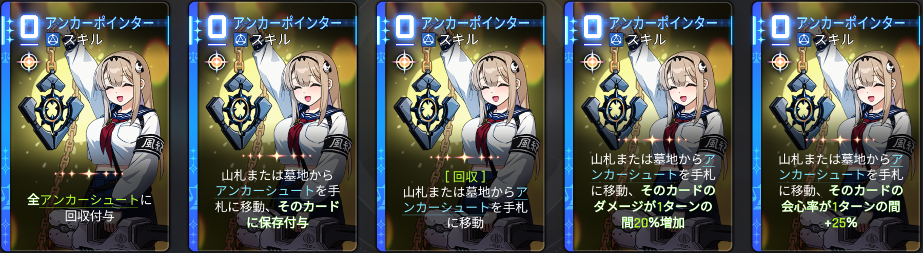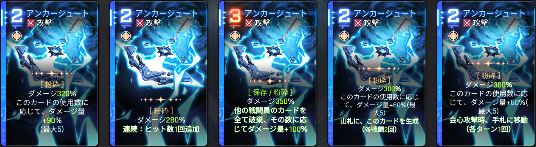| 0 | スキル | 山札または墓地からアンカーシュートを手札に移動、そのカードの会心率が1ターンの間+25% |