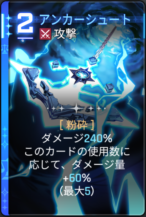 | 2 | 攻撃 | [粉砕3)]ダメージ240%。このカードの使用数に応じてダメージ量+60%(最大5) |
