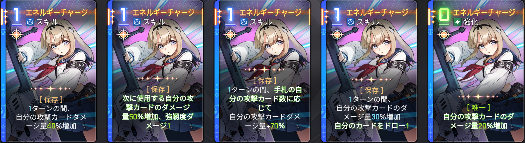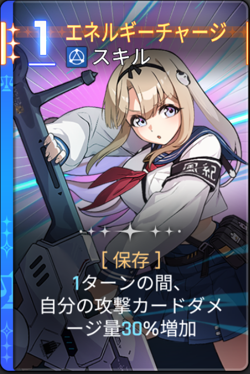 | 1 | スキル | [保存]1ターンの間、手札の自分の攻撃カード数に応じて自分の攻撃カードダメージ量+70% |